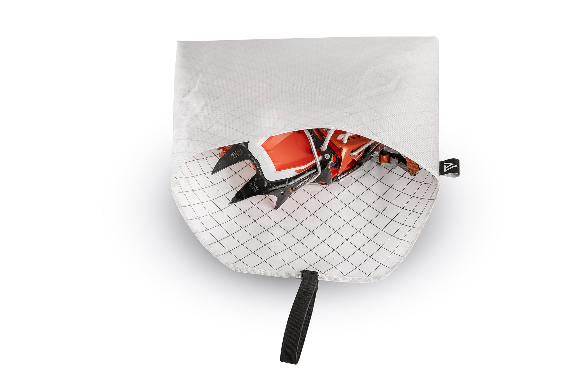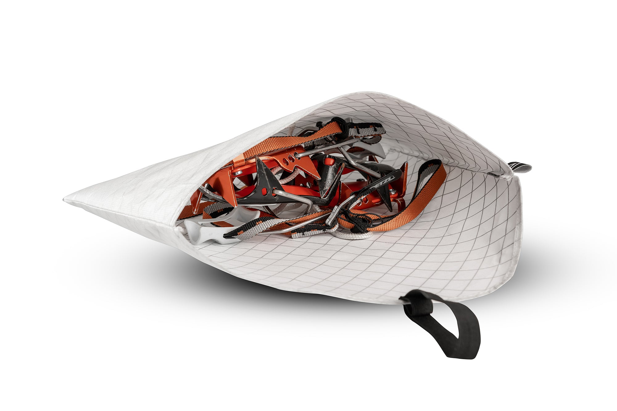 Durable and light pouch for crampons and other sharp objects. This pouch features roll-top closure with elastic webbing for security and small loop for carabiner to ensure user friendliness when handling in vertical terrain.
