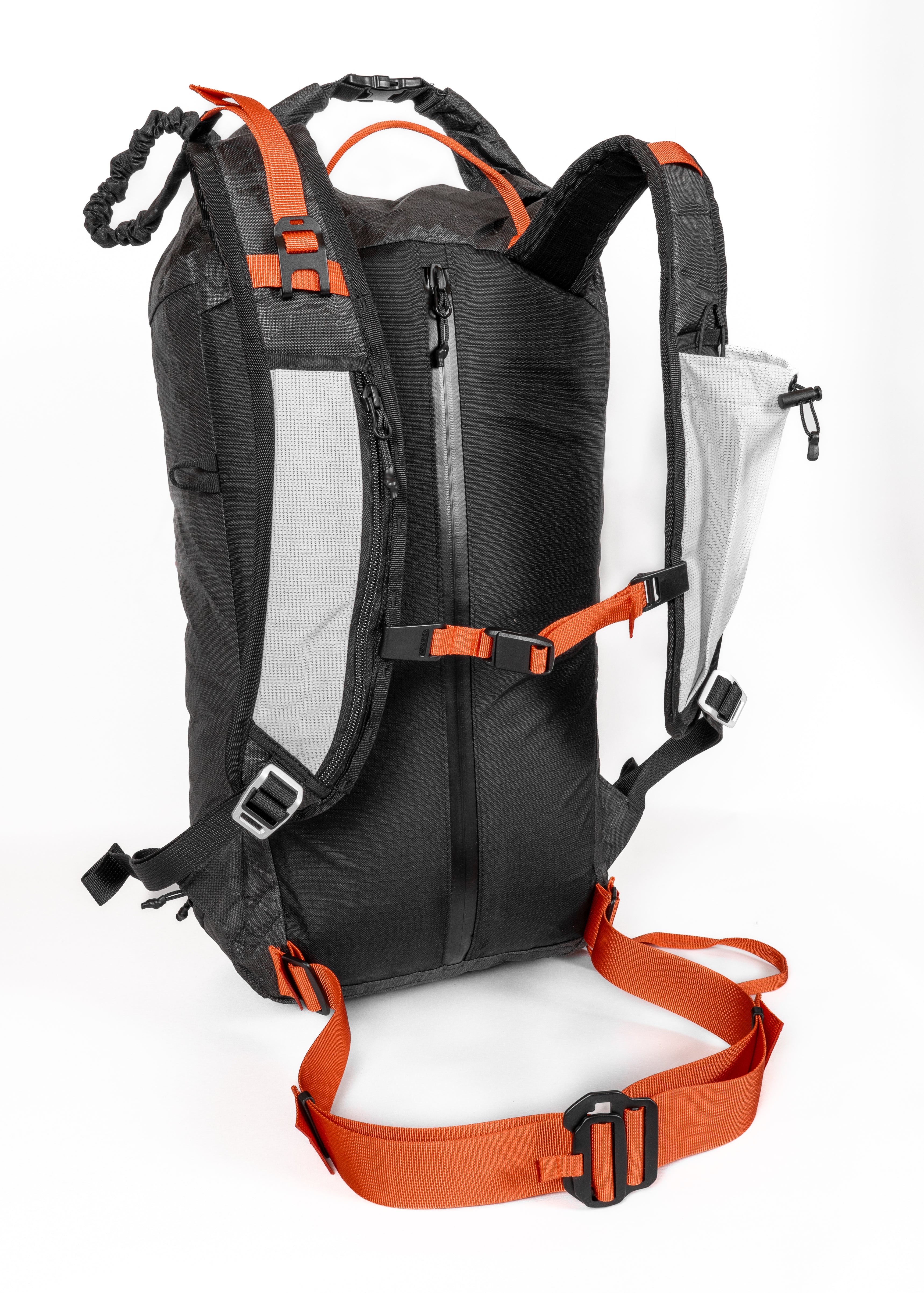 Developed in partnership with mountain running legend Markus Kröll, the Steep-Line 25L+ is designed for fast ski ascents in technical alpine terrain. Crafted from durable Ultra400X fabric, it balances robustness and functionality. Features include dual shoulder strap pockets for essentials and soft bottles, an external back zippered entry, and a compartment for keys or wallet. The side stretch pocket allows skin storage without removing the pack, while ice axe holders double as side straps for rope security. The padded EcoPak EPLX450RS back panel and removable 38mm webbing hip belt ensure comfort. Additional innovations include a magnetic roll-top closure, a removable ski carry adjustable strap also usable as top lid strap for rope security, and a bottom-access avalanche gear compartment adaptable for rope storage on summer days.