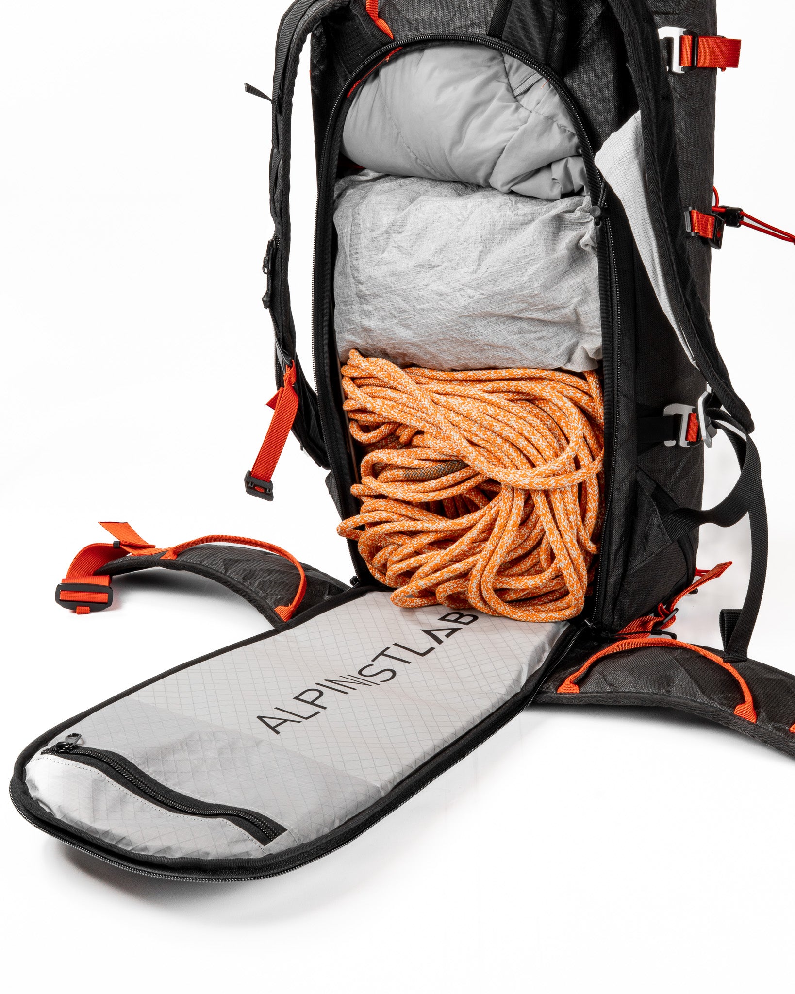 This bottom-access compartment can be reached even while wearing the backpack. In summer, it can be used as a rope storage with locking zipper sliders ensuring it won't open while dragging the rope out.